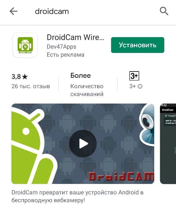 Для начала нам необходимо скачать приложение на телефон, переходим по этой ссылке , либо, в вашем магазине приложений на телефоне (Play market) , в поиске находим приложение “DroidCam” . Нажимаем кнопку “Установить” . (рис. 1)