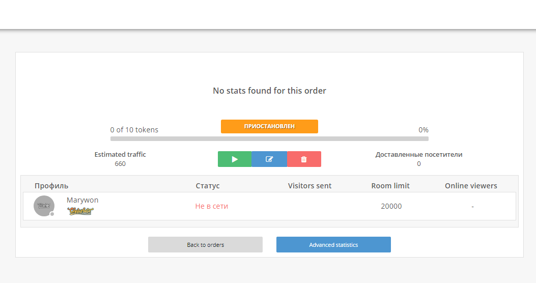 Спускаемся вниз после настройки, и покупаем необходимое количество токенов (Минимальный пакет стоит 5$ - вы получите 50 токенов). После покупки, пакет автоматически активируется, действие пакета начнется только тогда, когда вы будете на трансляции. В момент паузы, или же в режиме оффлайн трафик никуда не денется. Статистику трафика вы можете наблюдать на открывшейся странице (рис. 11). Здесь указывается статус (онлайн вы, или оффлайн), сколько посетителей уже было отправлено на страницу, лимит посетителей, а так же количество посетителей в вашей комнате в режиме Online.