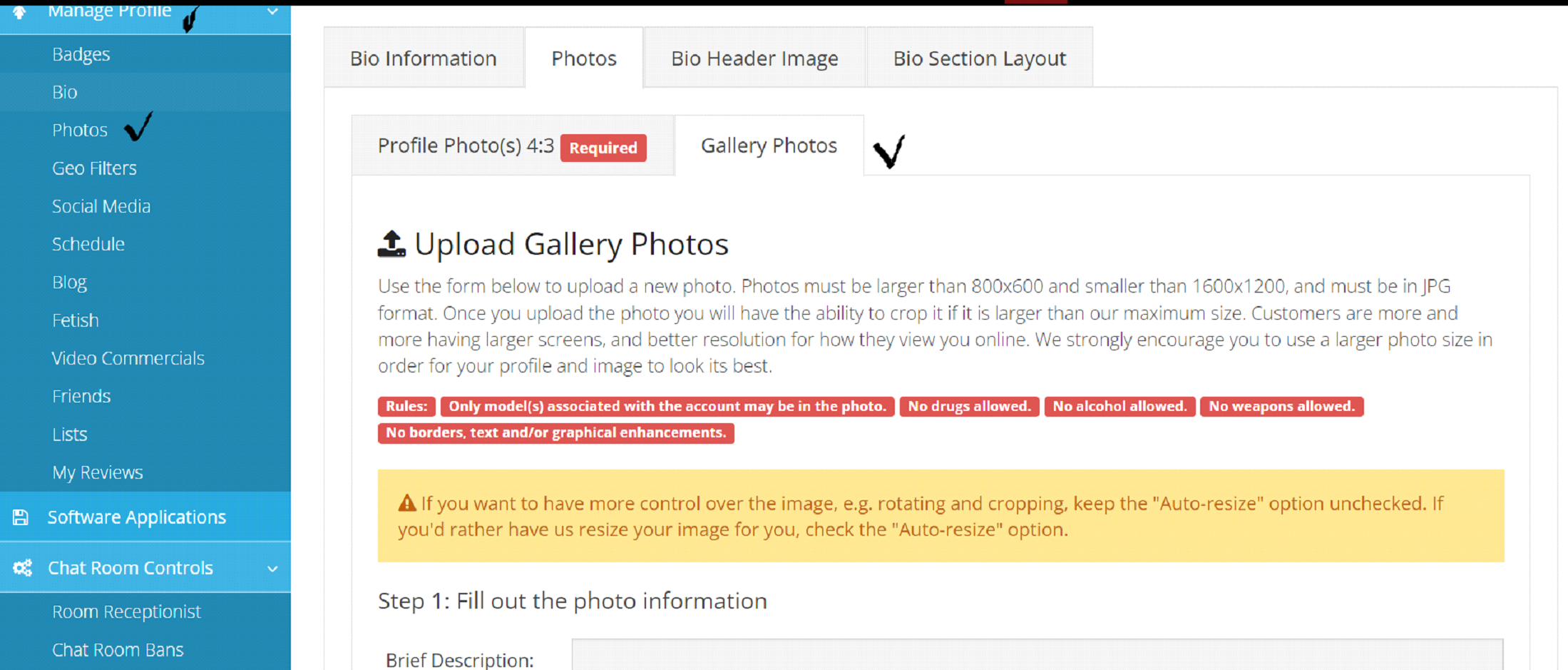 Загрузить 50 фотографий в профиль (Manage profile-Photos-Gallery photos-Кнопка Upload a file). (рис. 4).