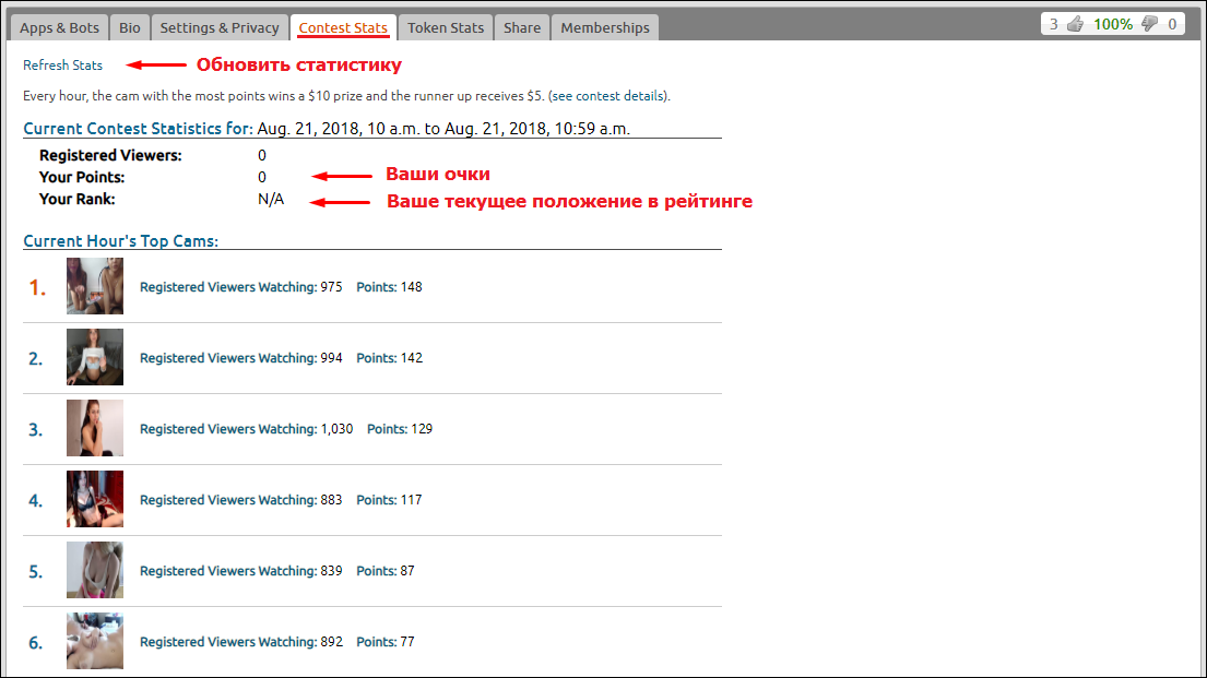 На Chaturbate каждый час трансляция с наибольшим количеством очков выигрывает 10$, второе место выигрывает 5$.