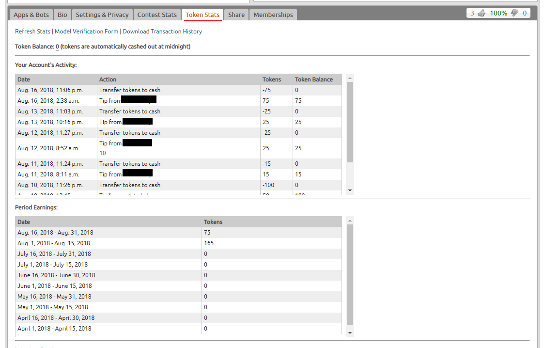 Вкладка «Token Stats» История ваших токенов и заработка по периодам.