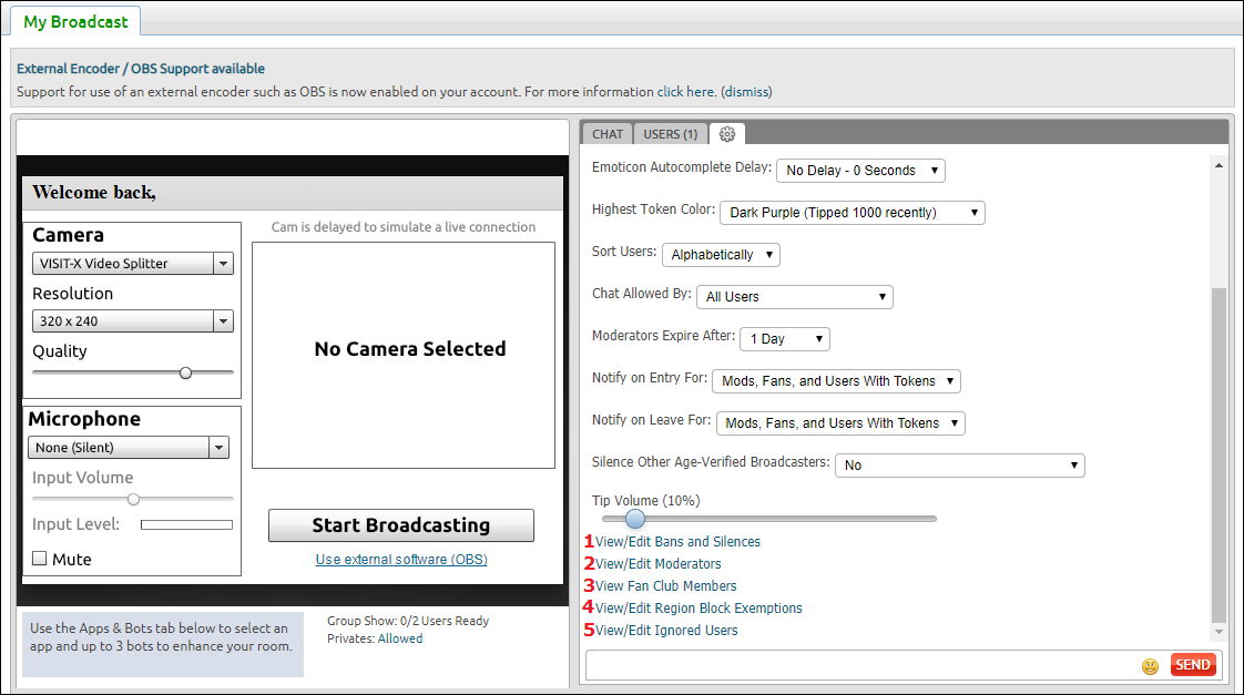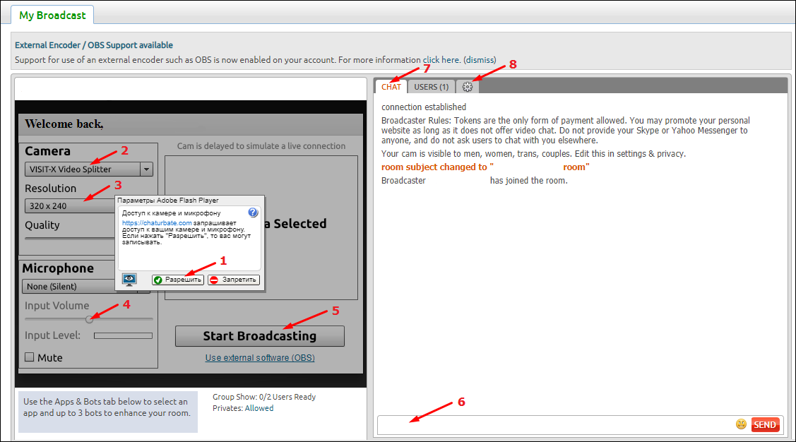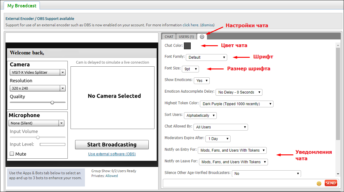 5.) Нажимаем кнопку "Start Broadcasting" для начала трансляции. Чтобы закончить - нажимаем "Stop Broadcasting"