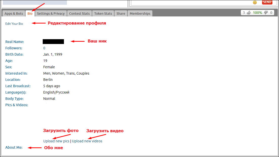 Здесь вам доступно редактирование возраста, пола, места проживания, кем интересуетесь, владение языками, а так же добавление ваших фотографий и видео.
