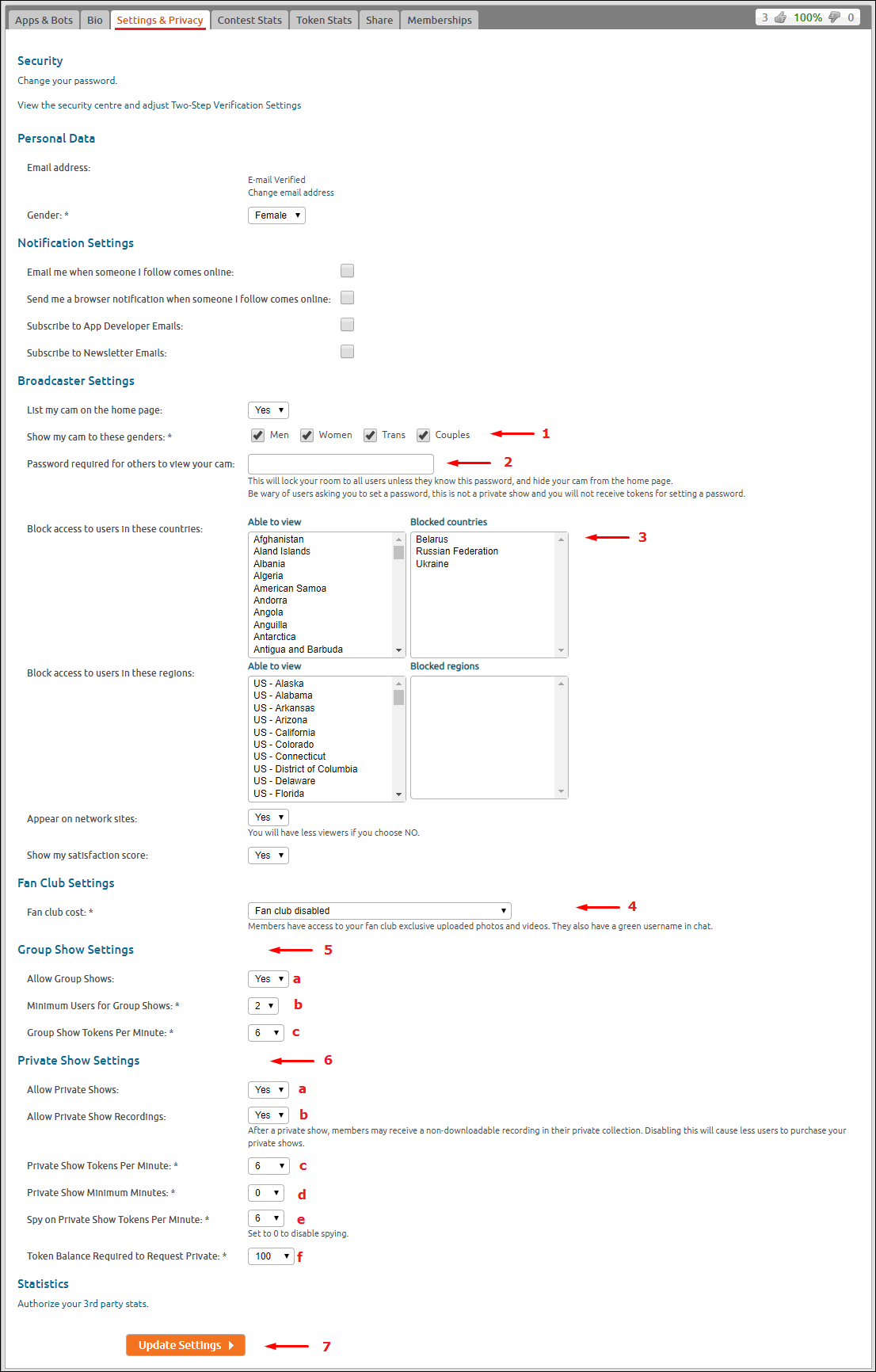 - Настройки вашего приватного шоу
