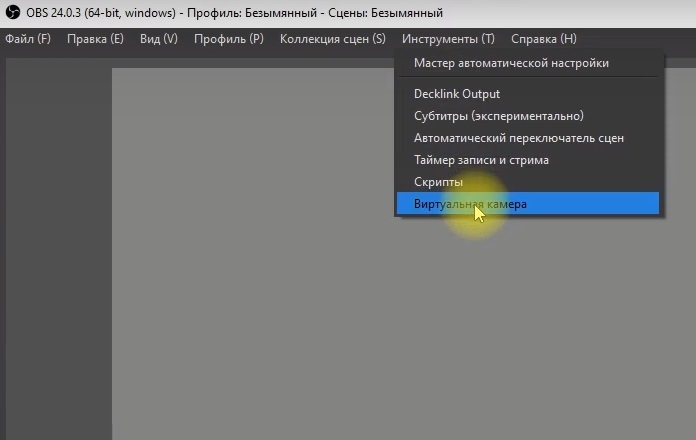 После завершения установки открываем программу OBS, в верхнем меню программы переходим в "Инструменты", в самом конце списка выбираем "Виртуальная камера" (рис. 1)