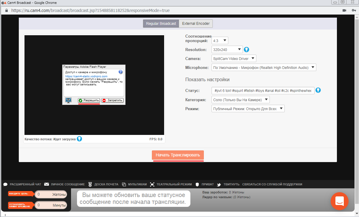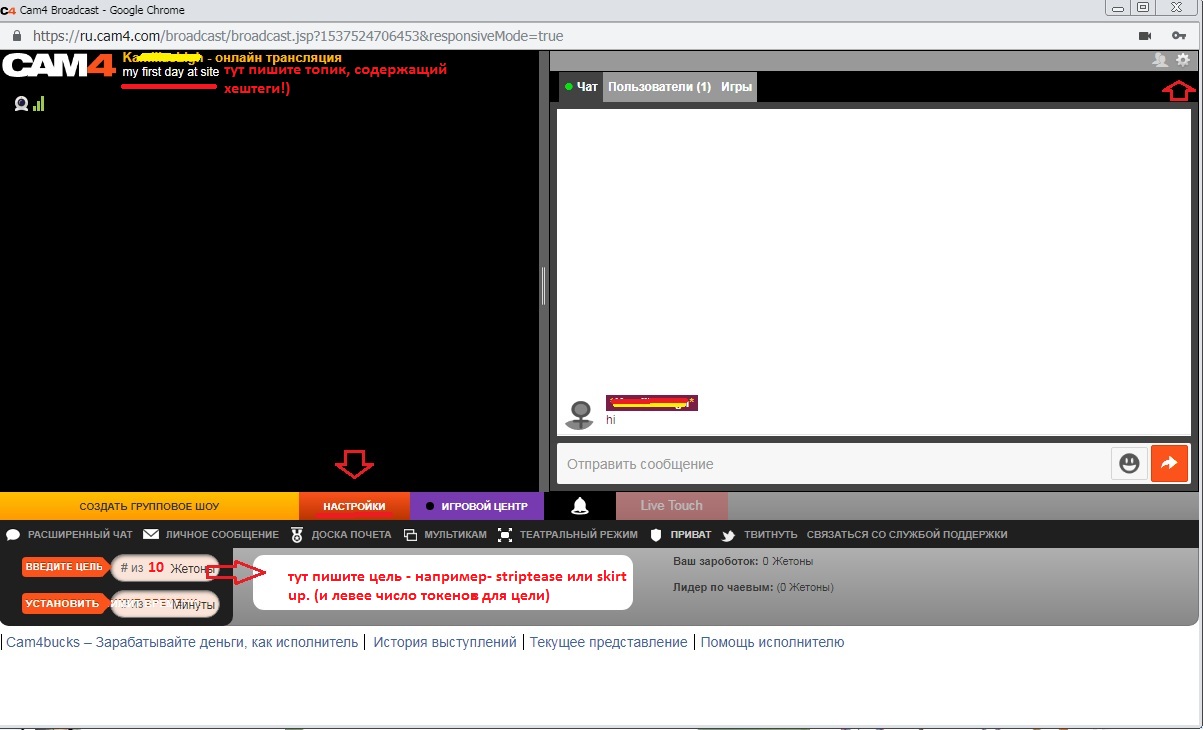 Далее напишите ваш Статус (топик комнаты, должен содержать ваши Хештеги! #new #skype - Да-да! Мы не опечатались! Кам4 - единственный сайт, который позволяет за токены продавать свой скайп! Но учтите, сайт так же запрещает прием оплаты за пределами сайта за шоу.)